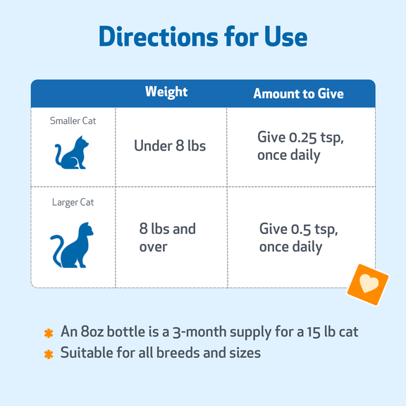 - 8 oz (236 ml) bottle is a 3-4 month supply for most cats